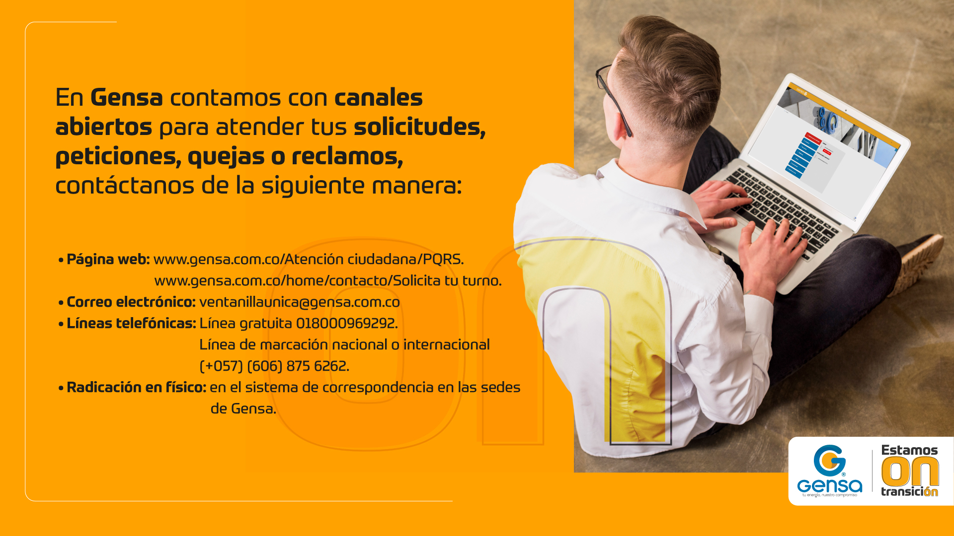 Twitter Facebook Youtube Instagram Mapa del Sitio Menú Cerrar Atención ciudadana PQRS Organigrama Participación ciudadana Comunicaciones Resolución 080 Instructivo PB Cerrar Atención ciudadana PQRS Organigrama Participación ciudadana Comunicaciones Resolución 080 Instructivo PB info Lineas de negocio Institucional Transparencia Proveedores y Contratistas Contacto Banner-Canales-para-peticionesBanner-Canales-para-peticiones Conoce nuestras Líneas de Negocio Conoce más Gensa Conoce más aquí Conoce el marco de Transparencia en la empresa Conoce más Acceso a Proveedores y Contratistas Conoce más Conoce nuestros Mecanismos de contacto Contáctanos Entidades Relacionadas